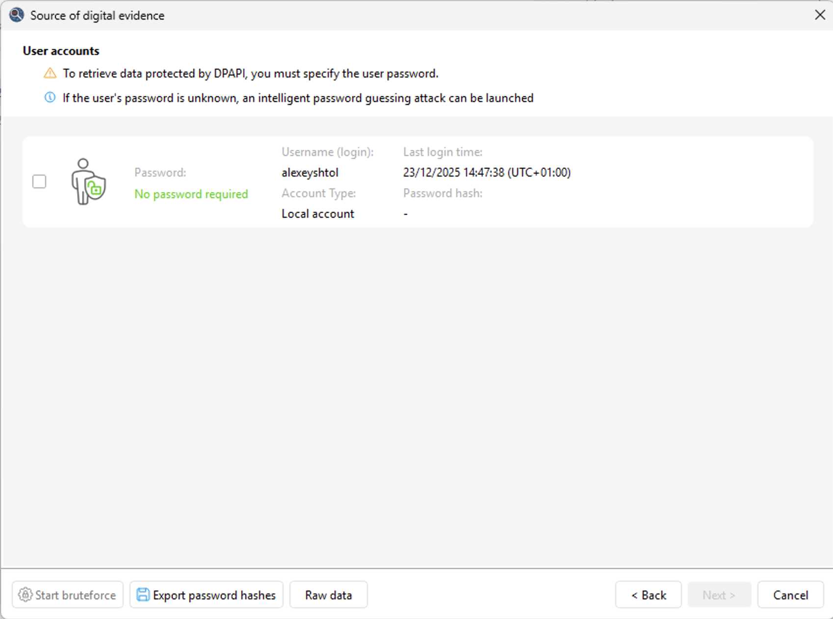 Finally, Elcomsoft Quick Triage pays special attention to credentials and protected data. The tool extracts Windows Vault entries, DPAPI-related data, cryptographic keys, certificates, and user and system credential stores. All artefacts are preserved with clear source attribution and context, allowing investigators to quickly focus on the most relevant evidence and make informed decisions without waiting for a full forensic examination.